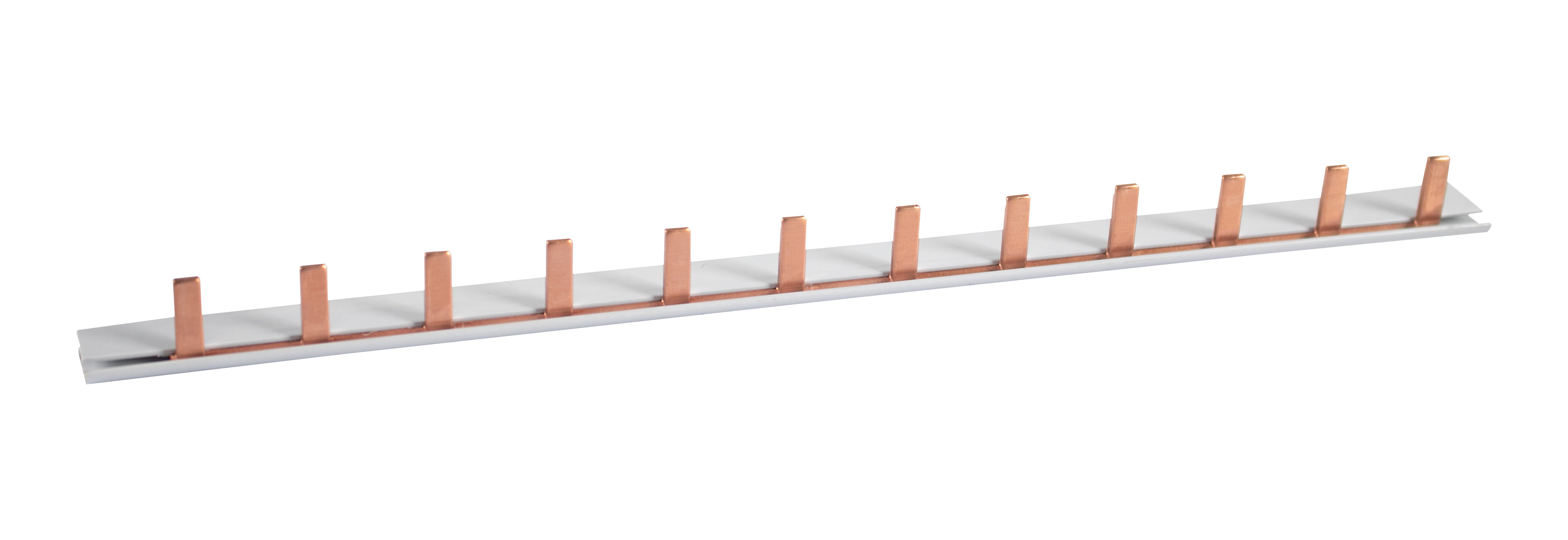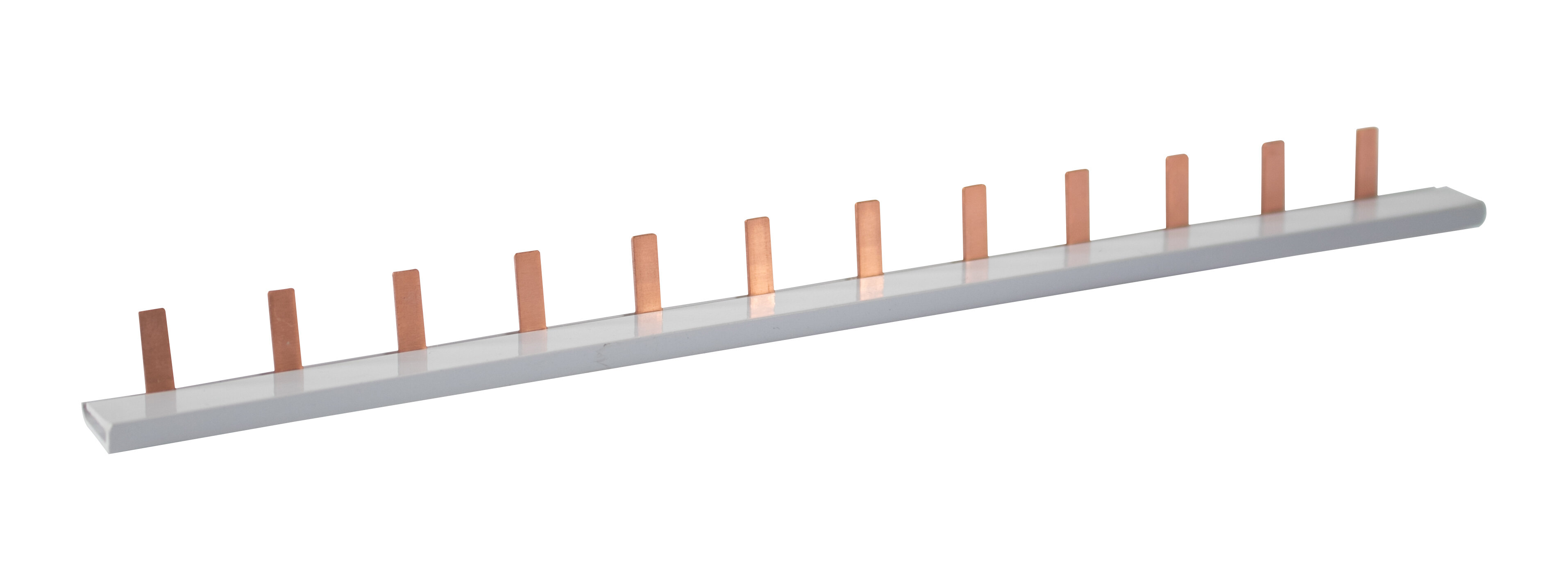 1-fase fasestang, 12HP, penaansluiting, standaard met eindkappen. 10mm². Vergelijkingsnummers ABB PS1/12, HABER KB163A, POLLMANN S-1L-210/10, Siemens 5ST3735