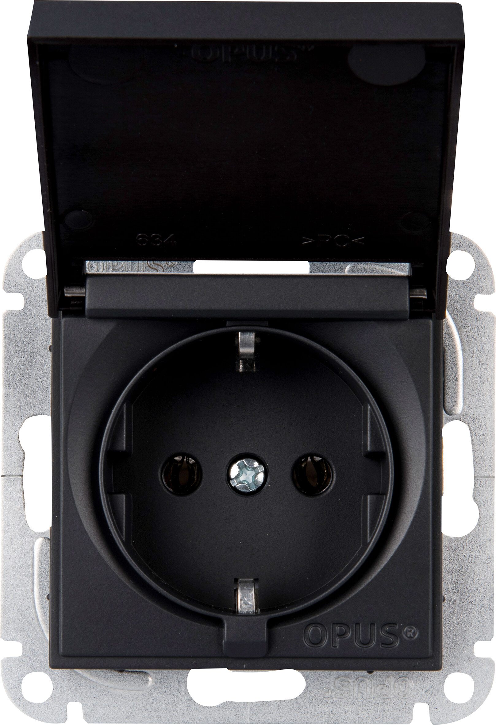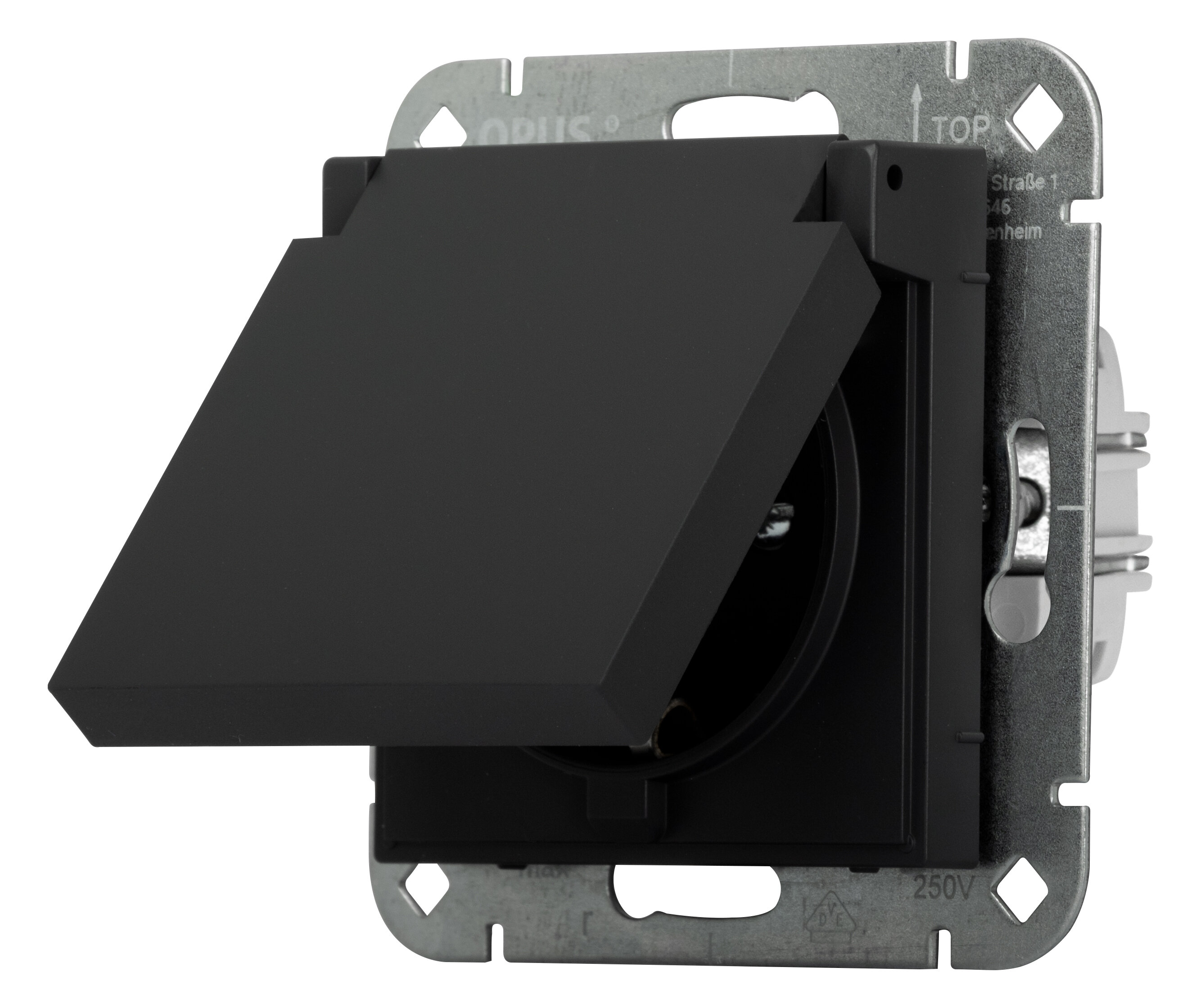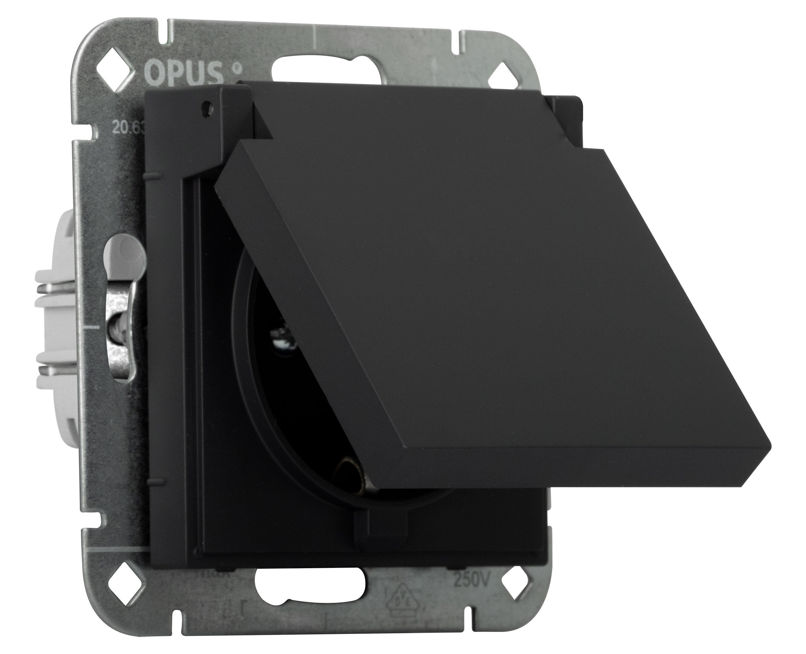 Productinformatie "OPUS 55 geaarde contactdoos met verend klapdeksel matzwart"