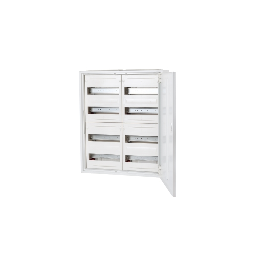 FV 2-4; 2-voudig, 4-rijig, 96 modules; Paneelverdeler; Kastdiepte 165 mm; Royale kabelinvoeren onder, boven en achter per paneelbreedte; Bovenste en onderste kabelinvoer met doordrukmembraan, dus snelle en eenvoudige bediening zonder extra gereedschap; Alle afdekkingen met zijdelingse schotten; Vanaf drie paneelbreedtes met dubbele deur; Verschillende slotvarianten mogelijk - ook DIN-cilinderslot; Incl. 1 x ZSSKN34 en 1 x ZSSKPE34 insteekklem per paneel; Materiaal: plaatstaal, hoogwaardige poedercoating.